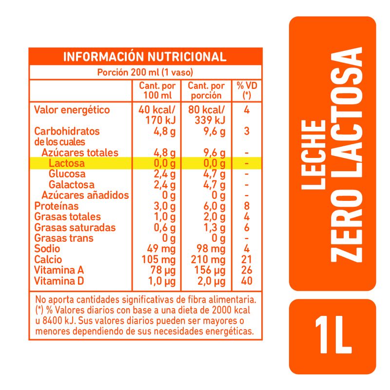Leche parcialmente descremada UAT homogeneizada, fortificada con vitaminas A y D. Sin lactosa. Libre de gluten