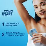 Fácil de usar, se aplica directamente en la piel. Quita la tapa y gira el disco de la base, aplícalo diariamente en las axilas y asegúrate de mantener el envase bien cerrado.