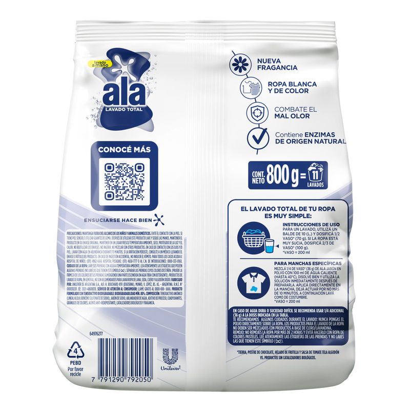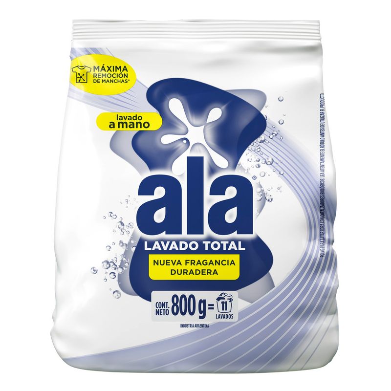 Además, su fragancia duradera proporciona a tus prendas un aroma fresco y agradable . ¡Ahora puedes despreocuparte por el mal olor con la tecnología contra el mal olor de ALA! Pensado para las familias argentinas, ALA se convierte en el aliado perfecto en la tarea del lavado. Con un enfoque en la educación de los niños y el cuidado del hogar, ALA se posiciona como una marca comprometida con el bienestar de toda la familia. 1 de cada 2 argentinos elige ALA para lavar sus prendas porque es imbatible contra las manchas! Nuevo jabon en polvo Ala Maxima blancura, con agente blanqueador. El jabón en polvo ALA elimina hasta las manchas más difíciles como aceite de cocina, salsa de tomate y helado de chocolate. El jabón en polvo ALA máxima blancura es ideal para ropa blanca y de color. El jabón en polvo ALA tiene una tecnología anti olores que combate eficazmente malos olores como sudor, moho y humo. El jabón en polvo ALA es eficiente hasta en ciclos cortos de lavado y agua fría. El jabón en polvo ALA proporciona una limpieza profunda para las prendas de toda la familia.