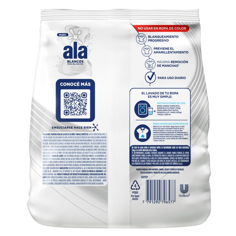 Ala es tu aliado perfecto para enfrentar las manchas más difíciles. Su poder de máxima remoción de manchas asegura que la suciedad no tenga chance, dejando tus prendas relucientes. Además, su composición no contiene cloro ni lavandina, lo que lo hace ideal para cuidar tus tejidos y prolongar la vida útil de tu ropa blanca favorita.