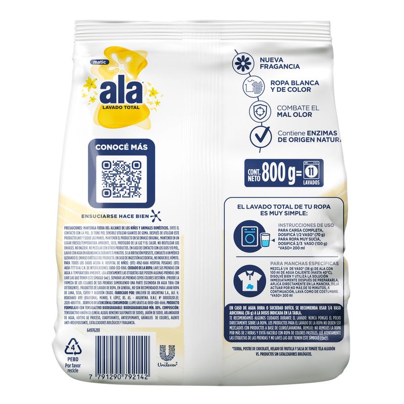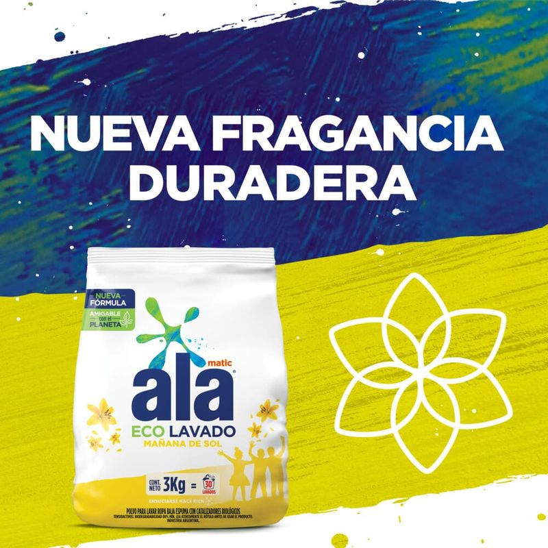 Además, su fragancia duradera proporciona a tus prendas un aroma fresco y agradable. ¡Ahora puedes despreocuparte por el mal olor con la tecnología contra el mal olor de ALA! Pensado para las familias argentinas, ALA se convierte en el aliado perfecto en la tarea del lavado. Con un enfoque en la educación de los niños y el cuidado del hogar, ALA se posiciona como una marca comprometida con el bienestar de toda la familia. 1 de cada 2 argentinos elige ALA para lavar sus prendas porque es imbatible contra las manchas! Nuevo jabón en polvo Ala matic Mañana de sol Máxima blancura, con agente blanqueador y su fragancia incomparable. El jabón en polvo ALA elimina hasta las manchas más difíciles como aceite de cocina, salsa de tomate y helado de chocolate. El jabón en polvo ALA máxima blancura es ideal para ropa blanca y de color. El jabón en polvo ALA tiene una tecnología anti olores que combate eficazmente malos olores como sudor, moho y humo. El jabón en polvo ALA es eficiente hasta en ciclos cortos de lavado y agua fría. El jabón en polvo ALA proporciona una limpieza profunda para las prendas de toda la familia.