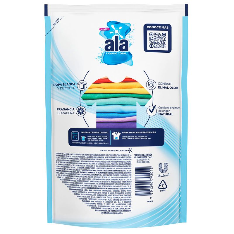 Además, su fragancia duradera proporciona a tus prendas un aroma fresco y agradable. ¡Ahora puedes despreocuparte por el mal olor con la tecnología contra el mal olor de ALA! Pensado para las familias argentinas, ALA se convierte en el aliado perfecto en la tarea del lavado. Con un enfoque en la educación de los niños y el cuidado del hogar, ALA se posiciona como una marca comprometida con el bienestar de toda la familia. ¡1 de cada 2 argentinos elige ALA para lavar sus prendas porque es imbatible contra las manchas! ¡Disfruta de todos los beneficios que solo el jabón liquido ALA te puede ofrecer! Nuevo jabón líquido Toque VIVERE Máxima blancura, fórmula con agente blanqueador. El jabón líquido ALA elimina hasta las manchas más difíciles como aceite de cocina, salsa de tomate y helado de chocolate. El jabón líquido ALA máxima blancura es ideal para ropa blanca y de color. Estos Jabones líquidos para ropa encapsulan y neutralizan los olores desagradables como el sudor, el moho o los olores de baño. Con este jabón líquido disfrutas de una fragancia duradera en tus prendas lavadas, que perdura incluso después de varios días. Estos Jabones líquidos para ropa son perfectos para usar en ciclos cortos de lavado y con agua fría.