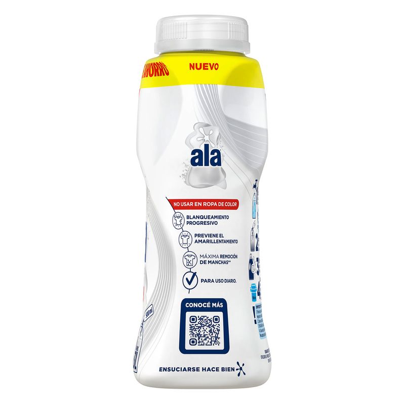 Sabemos que la ropa blanca impecable te da confianza, encontrá el Jabón Líquido Concentrado para Diluir ALA Baja Espuma en tu supermercado más cercano y descubrí cómo transformar tu rutina de lavado. ¡Dale a tu ropa blanca el cuidado que se merece! ALA Baja Espuma, exclusivo para ropa blanca. Su fórmula no solo limpia, sino que blanquea progresivamente las prendas blancas con cada lavado. El nuevo Jabón líquido concentrado para diluir ALA Baja Espuma previene el amarilleamiento, manteniendo la blancura original por más tiempo. Concentrado para diluir, ¡más rendimiento y ahorro con el Jabón Líquido ALA Baja Espuma! Protegé el blanco original de tu ropa: con el Jabón líquido concentrado para diluir ALA Baja Espuma los blancos duran más. Descubrí el poder de ALA Baja Espuma. Su fórmula innovadora sin cloro protege las fibras y blanquea tus prendas blancas de forma efectiva, dejándolas como nuevas. ALA Baja Espuma penetra profundamente en las fibras, eliminando hasta las manchas más rebeldes y devolviéndole la blancura a tu ropa.