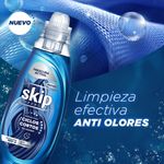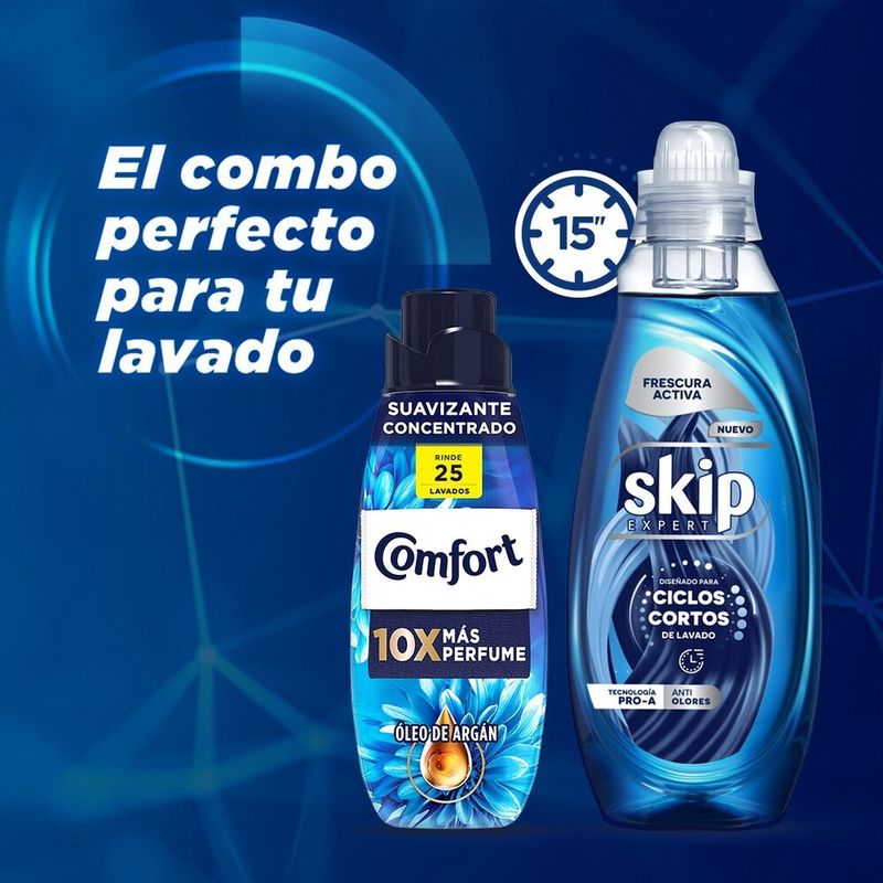 Con Skip Frescura Activa, tu ropa estará impecable, ¡incluso en ciclos de 15 minutos! Descubrí el único jabón líquido concentrado diseñado para ciclos cortos de lavado. ¡Con nueva tecnología que combate el mal olor! Su nueva fórmula tiene activos concentrados de limpieza de acción rápida que eliminan la suciedad y el mal olor. Con Skip Frescura Activa, lo rápido ahora es mejor: ¡prendas limpias y cuidadas incluso en ciclos de 15 minutos! Skip Frescura Activa combate el mal olor. ¡ideal para la ropa de gimnasio y deportiva! Su fórmula concentrada rinde 20 lavados. ¡Dosificá directo sin necesidad de diluir! Llená una tapita para tener un lavado. Skip para ciclos cortos remueven la suciedad invisible de tus prendas, sin dejar residuos.