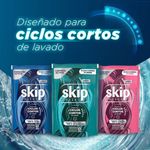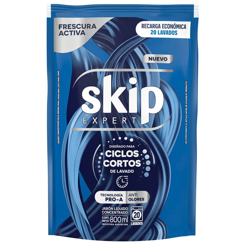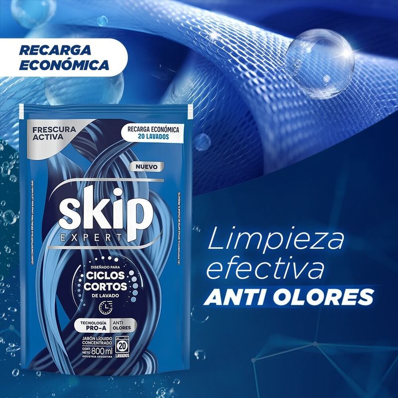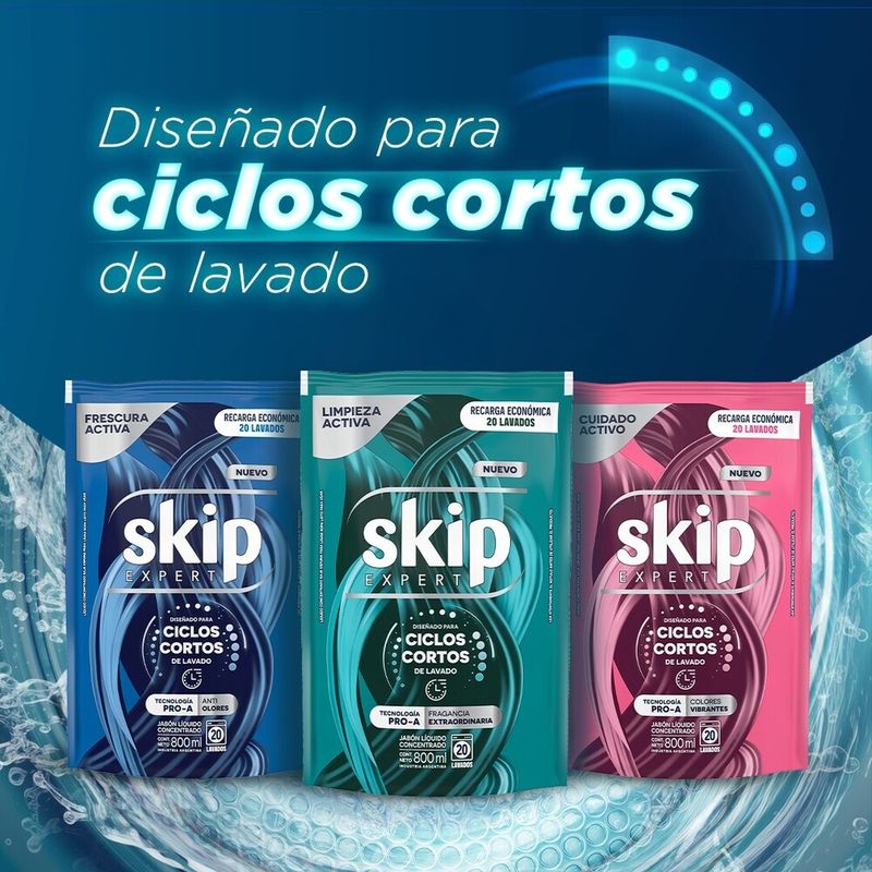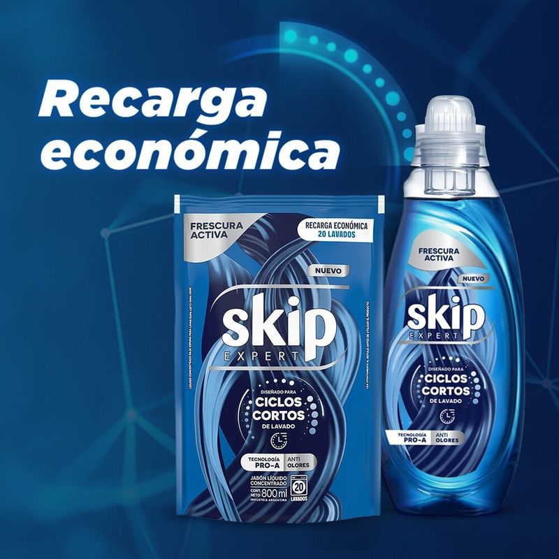 Con Skip Frescura Activa, tu ropa estará impecable, ¡incluso en ciclos de 15 minutos! Descubrí el único jabón líquido concentrado diseñado para ciclos cortos de lavado. ¡Con nueva tecnología que combate el mal olor! Su nueva fórmula tiene activos concentrados de limpieza de acción rápida que eliminan la suciedad y el mal olor. Con Skip Frescura Activa, lo rápido ahora es mejor: ¡prendas limpias y cuidadas incluso en ciclos de 15 minutos! Skip Frescura Activa combate el mal olor. ¡ideal para la ropa de gimnasio y deportiva! Su fórmula concentrada rinde 20 lavados. Trasvasá el sachet a la botella de Skip Frescura Activa y dosificá directo sin necesidad de diluir. Llená una tapita para tener un lavado. Skip para ciclos cortos remueven la suciedad invisible de tus prendas, sin dejar residuos.