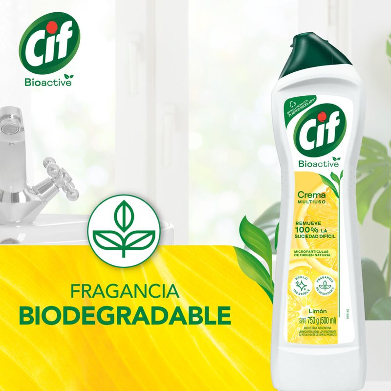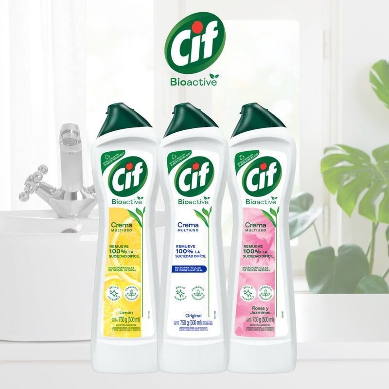 El nuevo Limpiador en crema CIF Bioactive Original (500 ml) contiene micropartículas de origen natural que ofrecen una máxima limpieza de las superficies con mínimo esfuerzo. La limpieza de CIF Crema es imbatible en muchas superficies, ya que brinda una limpieza profunda y remueve fácilmente las suciedades más difíciles haciendo que todas tus superficies queden increíblemente brillantes. Remueve 100% la suciedad difícil gracias a su única tecnología BIOACTIVE. Este producto de limpieza contiene una fragancia biodegradable para que cuides tus superficies al mismo tiempo que el medio ambiente. Además, su botella está hecha con plástico reciclado. Con la misma efectividad y rendimiento que ya conoces, revela la belleza de tus objetos una y otra vez. Algunas de las superficies de aplicación son: enlozadas, cromadas, de acero inoxidable, esmaltadas, de porcelana, de plástico, de goma, cerámicas, de cuerina, entre otras. Te sorprenderás al ver cómo los productos de limpieza de CIF Crema pueden remover de manera fácil las suciedades más difíciles del baño, la cocina, y hasta objetos tan sorprendentes como un par de zapatillas. Para su correcto uso: aplique una pequeña cantidad de Cif Crema sobre un paño húmedo (tipo Cif Ballerina) o directamente sobre la superficie a limpiar. Luego, simplemente, limpie la superficie y enjuague; Cierre bien la tapa después de usar. Para obtener resultados más brillantes, repase con un paño seco luego de enjuagar. Revela la belleza de todos tus objetos, con la misma efectividad y rendimiento que ya conoces. Ingresá a www.cif.com.ar y conocé los productos de limpieza CIF. Chau suciedad, bienvenida belleza.