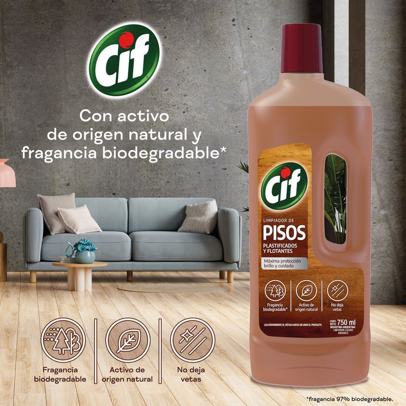 Nuevo Limpiador Líquido CIF Pisos Plastificados y Flotantes (Recarga Económica) es un limpiador para pisos plastificados y flotantes con tecnología de limpieza fácil, que brinda una limpieza profunda sin dañar el plastificado. El limpiador CIF para pisos es un producto de limpieza formulado con activos de origen natural, garantiza una máxima protección, brillo y cuidado en los pisos de tu hogar. El limpiador Cif Pisos no deja vetas. Además, es un limpiador con fragancia biodegradable que protege y cuida el medio ambiente. Al igual que otros materiales naturales, la madera se estropea fácilmente si no se la cuida como corresponde. Antes de limpiar pisos de madera, hay que saber si el piso está sellado o no. Los pisos sellados tienen una capa de barniz a prueba de agua; los pisos que no están sellados tienen solamente una capa de cera. Los pisos flotantes son baldosas sintéticas que simulan superficies de piedra, madera u otros materiales naturales. Estos pisos suelen estar hechos de materiales sintéticos duraderos que son fáciles de mantener. Limpiar pisos de madera es una tarea delicada, y el parquet es sensible a la humedad y a ciertos químicos, por ello Cif Pisos Plastificados y flotantes es un artículo de limpieza ideal para el hogar. Para un mejor uso del producto: Para pisos y grandes superficies utilizar tres tapas en cinco litros de agua. Según el piso a limpiar, la dosis recomendada puede variar para obtener el resultado adecuado. No es necesario enjuagar. Para manchas rebeldes, pase un paño tipo Cif Ballerina embebido con el producto puro. ¡Conocé el nuevo limpiador de pisos CIF Plastificados y Flotantes para brindarle brillo, cuidado y una limpieza superior a los pisos de tu hogar! Limpiador líquido CIF Pisos Plastificados y Flotantes te brinda una tecnología de limpieza fácil. Este limpiador de pisos garantiza una máxima protección, brillo y cuidado en los pisos de tu hogar. CIF Pisos Plastificados y Flotantes está formulado con activos de origen natural. Es un limpiador con fragancia biodegradable que protege y cuida el medio ambiente. El limpiador Cif Pisos no deja vetas. Conocé el nuevo limpiador de pisos CIF Plastificados y Flotantes para brindarle brillo, cuidado y una limpieza superior a tus pisos.
