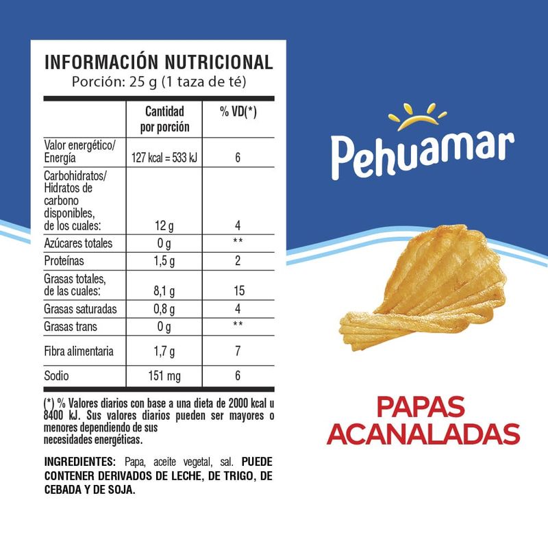 Las Papas fritas Pehuamar tienen una forma acanalada, una textura crujiente y están perfectamente sazonadas. Este snack posee un exquisito sabor y es especial para la picada del fin de semana.