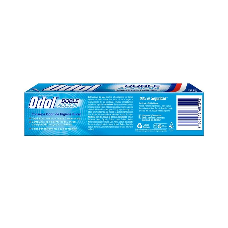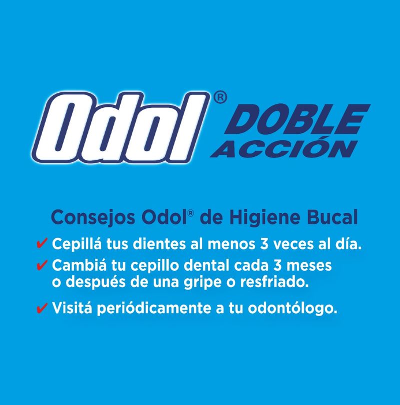 La Nueva pasta dental Odol Doble Efecto contiene flúor y calcio para unos dientes fuertes y protegidos. Su fórmula con flúor ayuda a reforzar el esmalte dental y remover la placa, brindando dientes blancos y limpios.