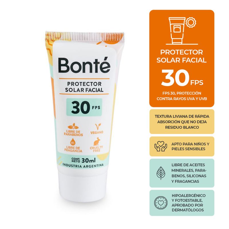 Protector solar facial SPF 30, diseñado para el uso diario en la rutina de cuidado. Su fórmula combina filtros solares modernos, fotoestables y seguros, con una textura liviana y libre de perfume. Ideal para consumidores que buscan protección confiable, sensorial agradable y excelente relación precio–calidad, fiel al ADN Bonté: “cuidarte todos los días de forma simple y accesible”.