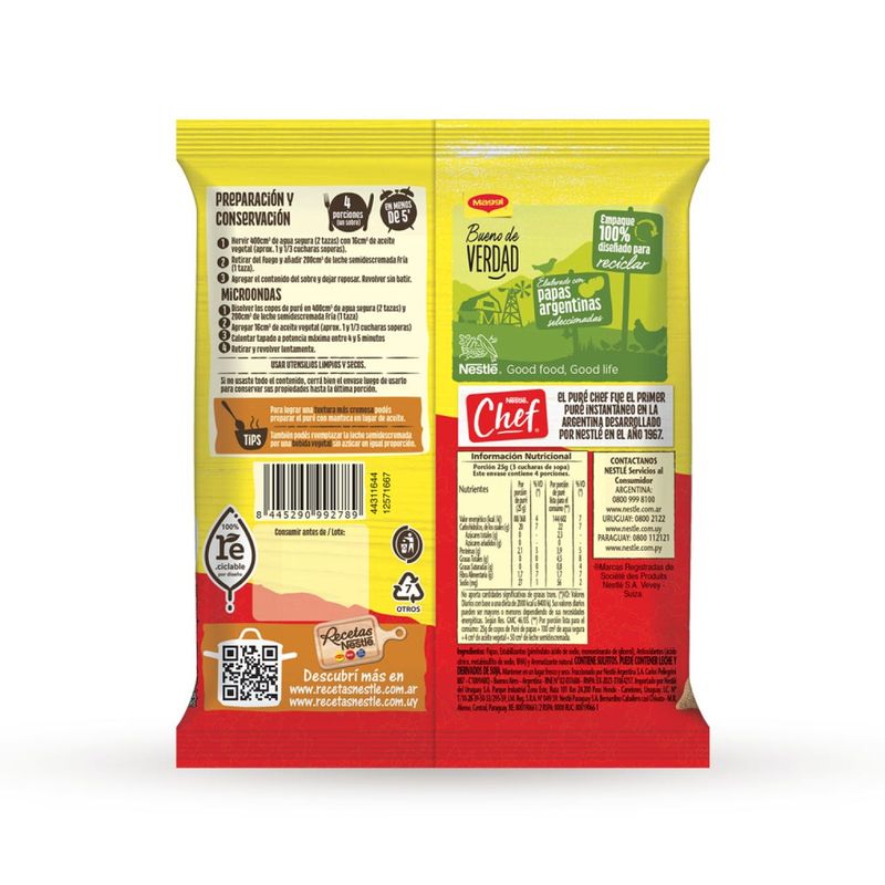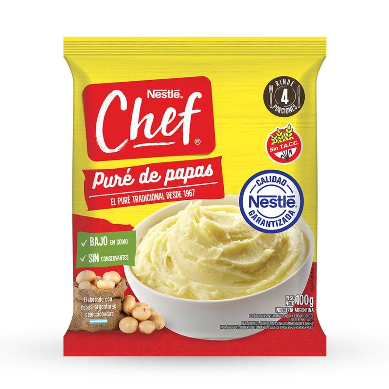 Unidad de 100 gramos. Producto elaborado a base de papa sabor a crema instantáneo para preparar puré. Libre de gluten. Sin TACC.