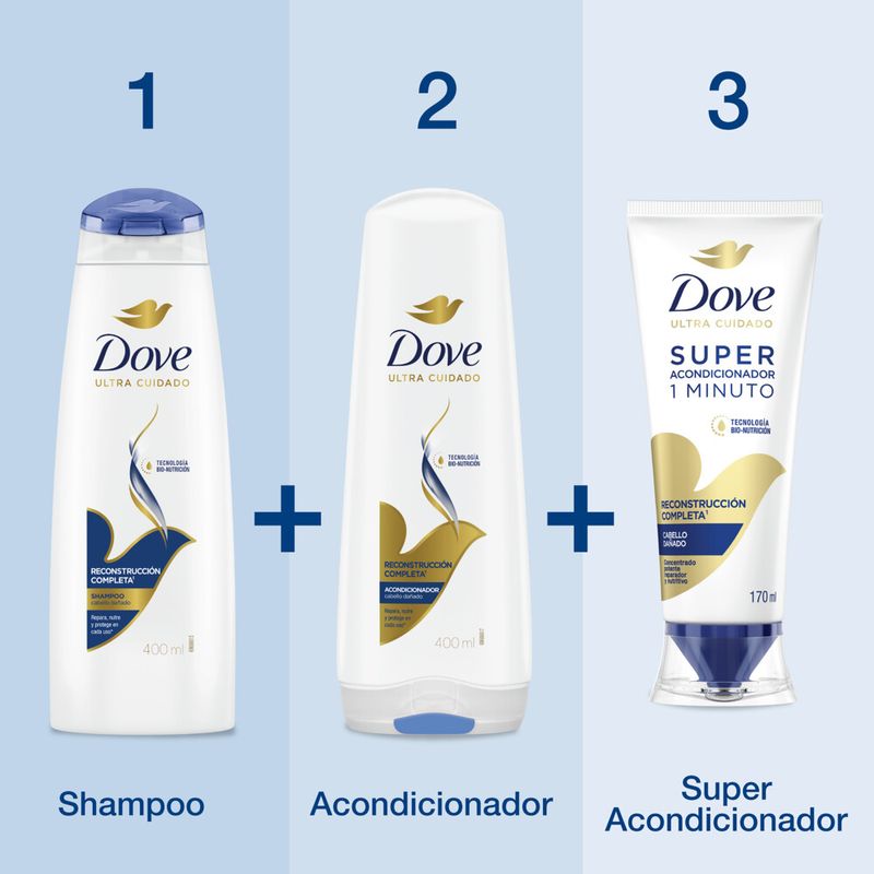 El pelo sufre tensiones y se daña con el tiempo, a pesar de nuestros mayores esfuerzos. ¿Sabías que con el tratamiento capilar correcto para el cabello dañado, podés restaurar la fortaleza de tu cabello contra el quiebre y hacer que se vea más saludable a lo largo del tiempo? Creamos una formulación única que con el uso continuo repara visiblemente y nutre progresivamente el cabello dañado: Shampoo Dove Reconstrucción Completa (180 ml). Su exclusiva fórmula con nutrientes y péptidos, trabaja en armonía con la biología natural del cabello para nutrirlo y repararlo en cada uso*. Nueva línea Dove Ultra Cuidado con Tecnología Bio-Nutrición. La fórmula repara los signos de la superficie dañada, haciendo que tu pelo se vea y se sienta con mayor suavidad y fuerte contra el quiebre. También penetra las fibras para brindar una nutrición profunda del pelo, haciendo que se vea más saludable lavado tras lavado. Instrucciones de uso: moja completamente el pelo y masajea el shampoo delicadamente sobre el cuero cabelludo. Enjuagá bien. El pelo está expuesto durante todo el año a factores ambientales que pueden dañarlo, por eso, Dove te propone cuidarlo: repararlo, nutrirlo e hidratarlo con los productos para el pelo adecuados. Así podrás lucir un cabello extraordinario y con una suavidad inigualable, porque nuestro pelo refleja cómo somos y cómo nos sentimos en cada momento. Para conseguir un mejor efecto en el pelo, usar toda la línea Dove Reconstrucción Completa y completarás el tratamiento reparador que te ayudará a tener un pelo más fuerte y resistente al daño. Fuerza y resistencia contra el quiebre con el uso de shampoo y acondicionador de la línea comparado con shampoo sin ingredientes acondicionantes.* Para conocer más sobre los productos para el cabello ingresá a www.dove.com.ar y descubrí tu rutina de cuidado.
