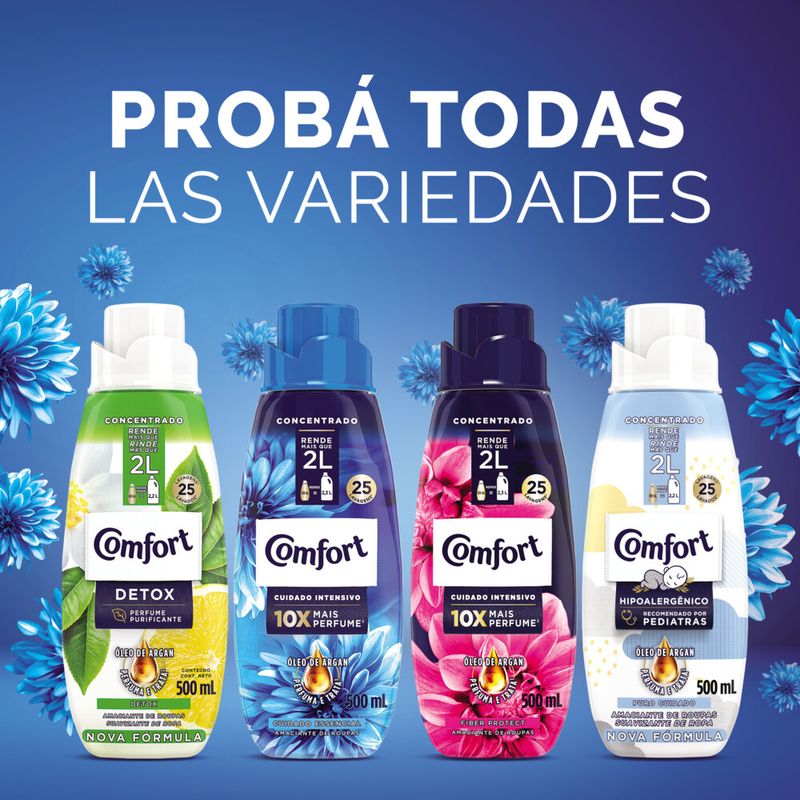 El Suavizante Concentrado Para Ropa Comfort Frescor Intenso (450 ml) tiene una nueva fórmula con perfume imbatible y hace que tu ropa dure mucho más. Su nueva fórmula con óleo de argán (un aceite natural con alto potencial nutritivo) previene los daños causados por el lavado, manteniendo los colores de las telas vibrantes por más tiempo y la ropa muy perfumada. Este suavizante presenta una nueva fórmula: perfume imbatible versus formulación anterior de Comfort Cuidado Esencial. ¡El perfume del Suavizante Concentrado Para Ropa Comfort Frescor Intenso protege la tela del mal olor y deja una fragancia duradera en tus prendas! Perfuma y cuida tu ropa con menos de media tapita por lavado de Suavizante de Concentrado Para Ropa Comfort Frescor Intenso. Los ingredientes del Suavizante Concentrado para ropa Comfort Frescor Intenso son capaces de alinear y proteger la tela, reduciendo la fricción entre las fibras de su ropa durante el proceso de lavado. Con el suavizante Concentrado Para Ropa Comfort, tu ropa está libre de pelotitas, conserva su forma y color, dejándola como nueva. Comfort Concentrado tiene cápsulas de perfume que penetran en la tela durante el proceso de lavado, dejando tu ropa con mucha más fragancia incluso después del secado. ¿El motivo? Cuando te movés, estas cápsulas de perfume se rompen y liberan esta increíble fragancia, ¡haciendo que ese olor a ropa recién lavada dure mucho más! ¡Prueba el nuevo Comfort Concentrado con su nueva fórmula: perfume imbatible VS formulación anterior de Comfort Cuidado Esencial! ¡Suavizante Concentrado para ropa COMFORT con su nueva fórmula y ahora con perfume imbatible! Probá este suavizante concentrado para ropa y evitá la formación de pelotitas y perdida del color de tus prendas. Suavizante Concentrado Para Ropa Comfort Frescor Intenso con cápsulas de perfume que protegen contra el mal olor. Este suavizante para ropa tiene un rendimiento óptimo, con menos de la mitad de la tapa basta. El suavizante concentrado Comfort Frescor Intenso está compuesto por un perfume de larga duración.
