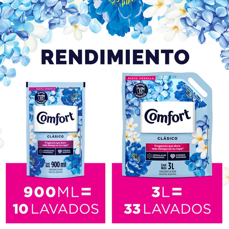 Los beneficios del nuevo Suavizante de ropa Comfort Clásico: nueva fórmula con cápsulas de fragancia que dura más tiempo en tu ropa, cuidado y suavidad. Comfort Clásico Suavizante de ropa Con Nueva Fórmula Comfort Clásico Suavizante Con Cápsulas de Fragancia Comfort Clásico Suavizante Rinde 33 lavados Comfort Clásico Suavizante ahora con más Cuidado y Suavidad Comfort Clásico Suavizante con Fragancia que Dura más Tiempo en tu Ropa Suavizante Comfort Clásico de Recarga Económica