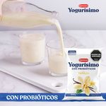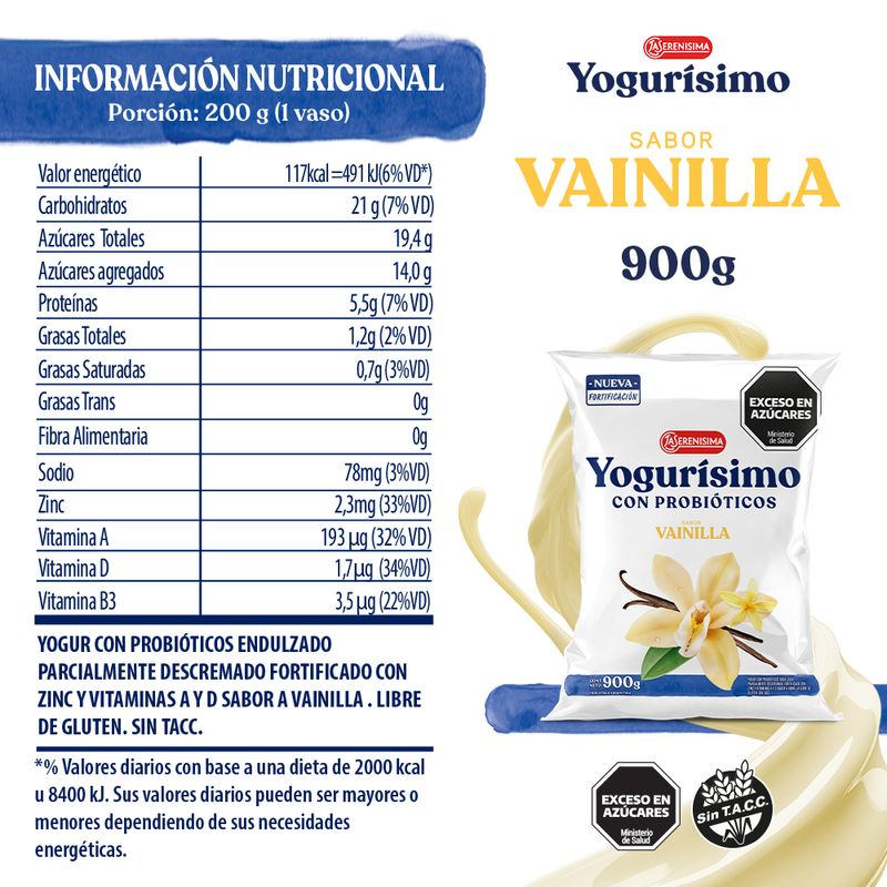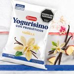 YOGURISIMO bebible, parcialmente descremado, sabor vainilla. Un yogur que te gusta. Refrescante y con ese delicioso sabor que te encanta, y lo mejor: funciona en cualquier momento del día. SACHET 900gr.?Yogur con probióticos endulzado parcialmente descremado fortificado con zinc y vitaminas A y D sabor a vainilla libre de gluten. Sin TACC.